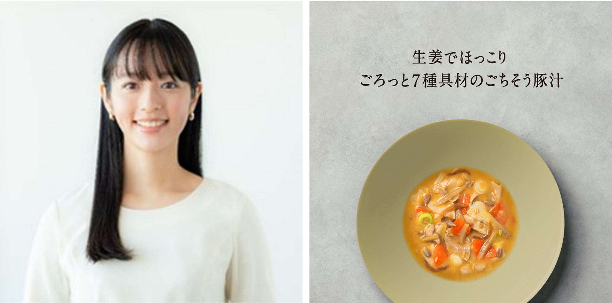 今回はそんな食事に気を遣う時間がない日でも、身体を整えられる野菜や食物繊維がとれるスープを考案しました。こだわりのポイントは、おうちご飯のように“ほっこり”してもらいたいという想いがあったので、身体が温まる生姜をたくさん入れ、塩辛くならないよう酒粕の量も調整しました。さらに豚バラと豚モモの量を調整し、スープでも歯ごたえがあり満腹感を感じられる主食になるような一品になっています。