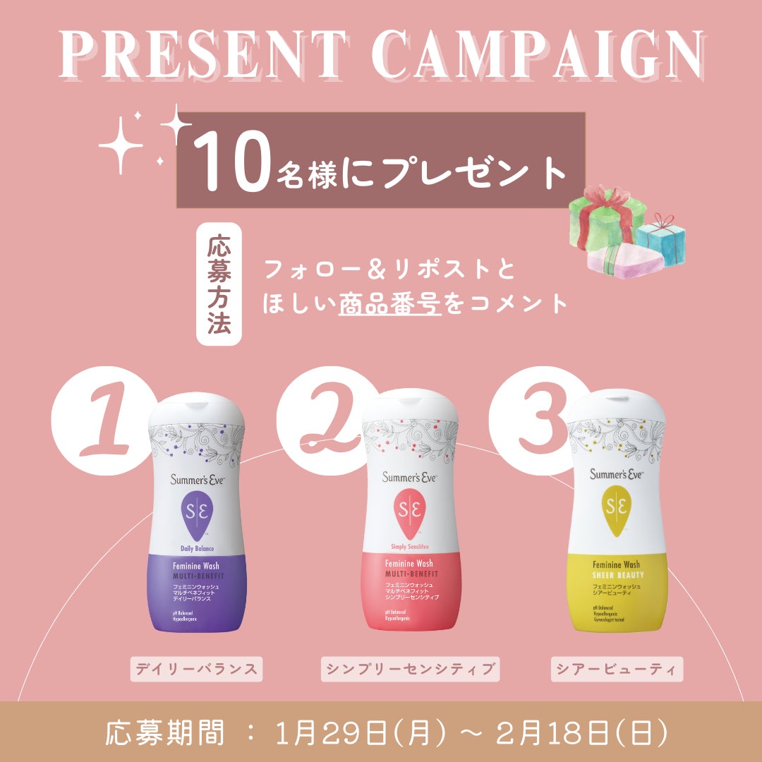 サマーズイブは、女性のさまざまなお悩みに合わせたラインアップをご用意していますが、どのアイテムを選べばいいのかわからない方も未だ多いのが現状です。そこで、デリケートゾーンによくあるお悩み3つにそれぞれ合わせたアイテムを知っていただくため、プレゼントキャンペーンを実施することとなりました。この機会に、ぜひお試しくださいませ。