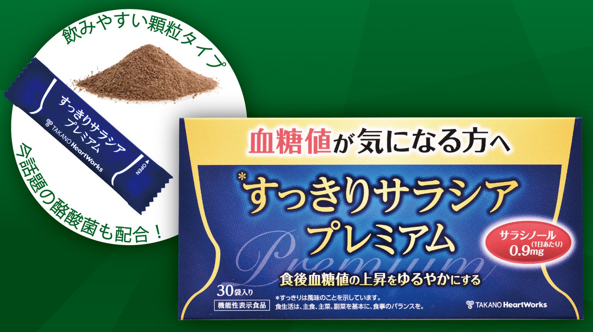 水に溶けやすい「顆粒」タイプ。サラシア由来サラシノールをタカノのサラシアシリーズ内で最も多い0.3mg/袋 配合。酪酸菌も配合しています。