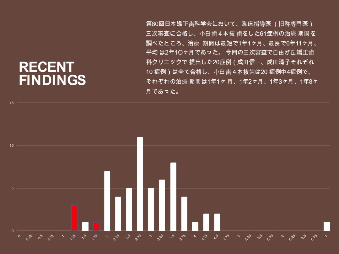 臨床指導医(旧称専門医)三次審査に合格し、小臼歯4本抜歯をした61症例の治療期間は治療期間は最短で1年1ヶ月、最長で6年11カ月、平均は2年10か月