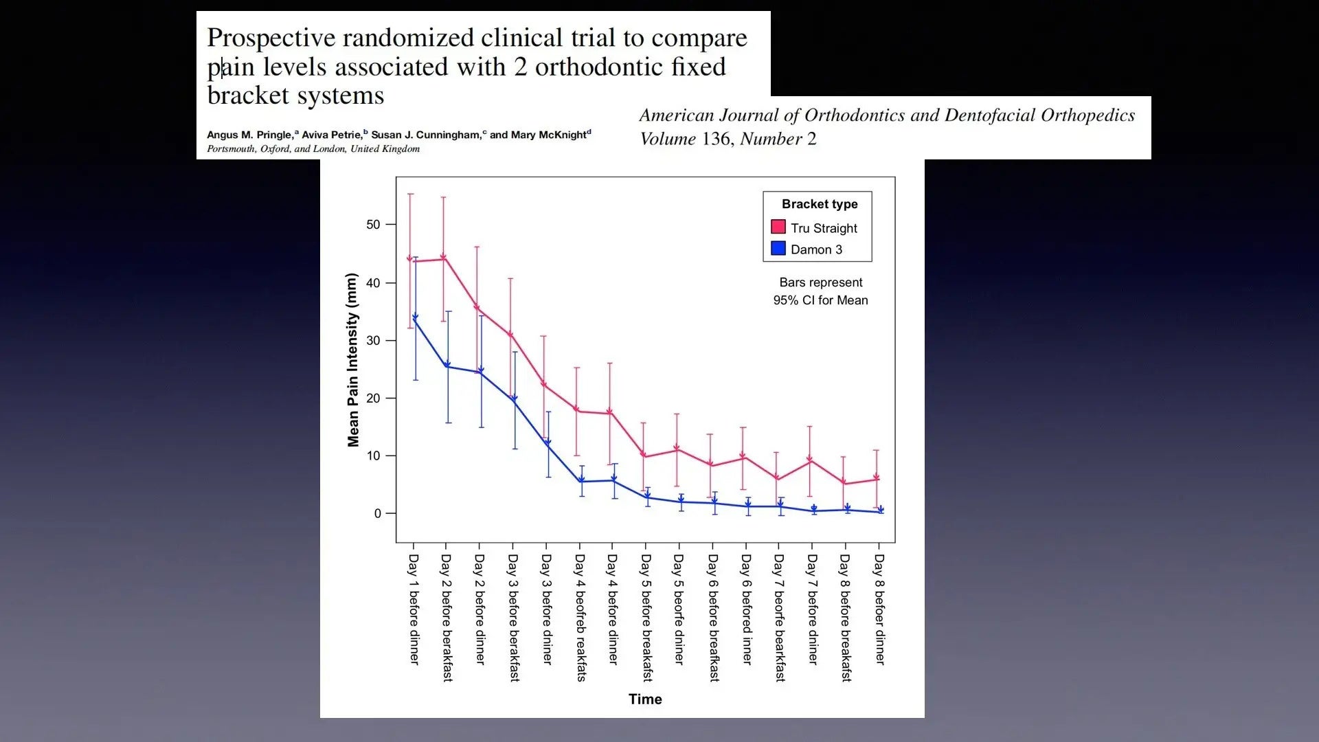 Pringle AM, Petrie A, Cunningham SJ, McKnight M. Prospective randomized clinical trial to compare pain levels associated with 2 orthodontic fixed bracket systems. Am J Orthod Dentofacial Orthop. 2009 Aug;136(2):160-7. doi: 10.1016/j.ajodo.2007.08.032. PMID: 19651344.