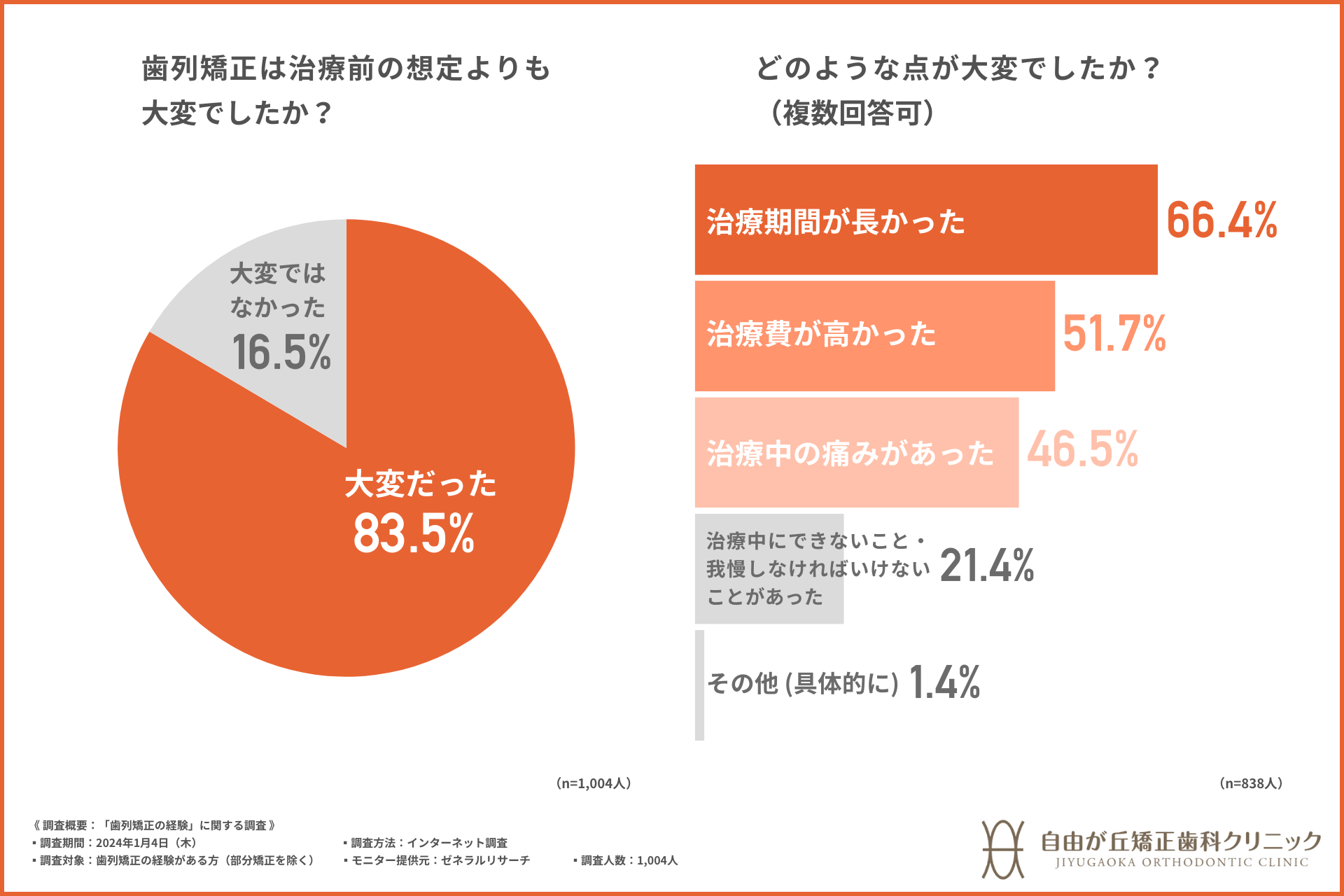今回の結果で、実際に歯列矯正を経験した方の83.5%が「想定していたよりも大変だった」と感じていたことが明らかになりました。