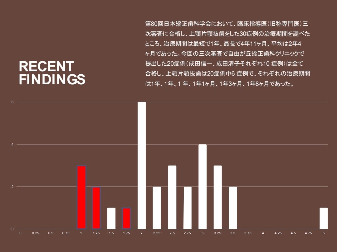臨床指導医(旧称専門医)三次審査に合格し、上顎片顎抜歯をした30症例の治療期間は治療期間は最短で1年、最長で4年11カ月、平均は2年4か月