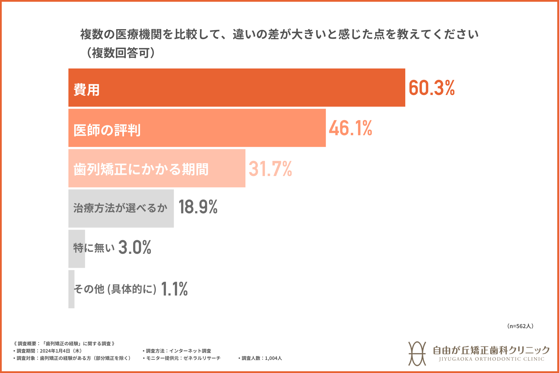 そこで、先ほどの質問で「した」と回答した方に、「複数の医療機関を比較して、違いの差が大きいと感じた点を教えてください(複数回答可)」と質問したところ、『費用(60.3%)』と回答した方が最も多く、次いで『医師の評判(46.1%)』『歯列矯正にかかる期間(31.7%)』と続きました。