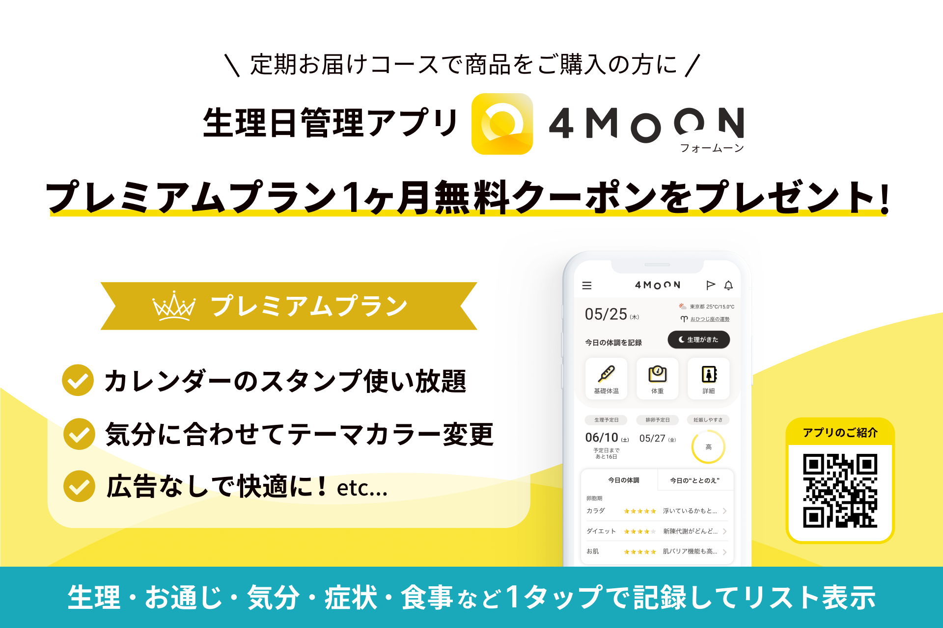 続けやすい&お得な『わたしプロローグ』定期お届けコースにて商品をご購入の方に、ヘルスケアアプリ『4MOON(フォームーン)』のプレミアムプラン1ヶ月無料クーポンをプレゼントいたします。