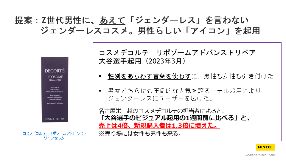 河端は、「しかし、ここまで見てきたデータを踏まえると、このZ世代の男性消費者とのコミュニケーションにおいても、ジェンダーレスであることをうたうのは効果的ではないでしょう。日本流のジェンダーレスコスメにおいては、あえてジェンダーレスという言葉は使用しない方が効果的であると考えます。」とし、メジャーリーガーの大谷選手を起用し、男性らしさの表現を保持したことで成功した、コスメデコルテの製品を例として挙げました。