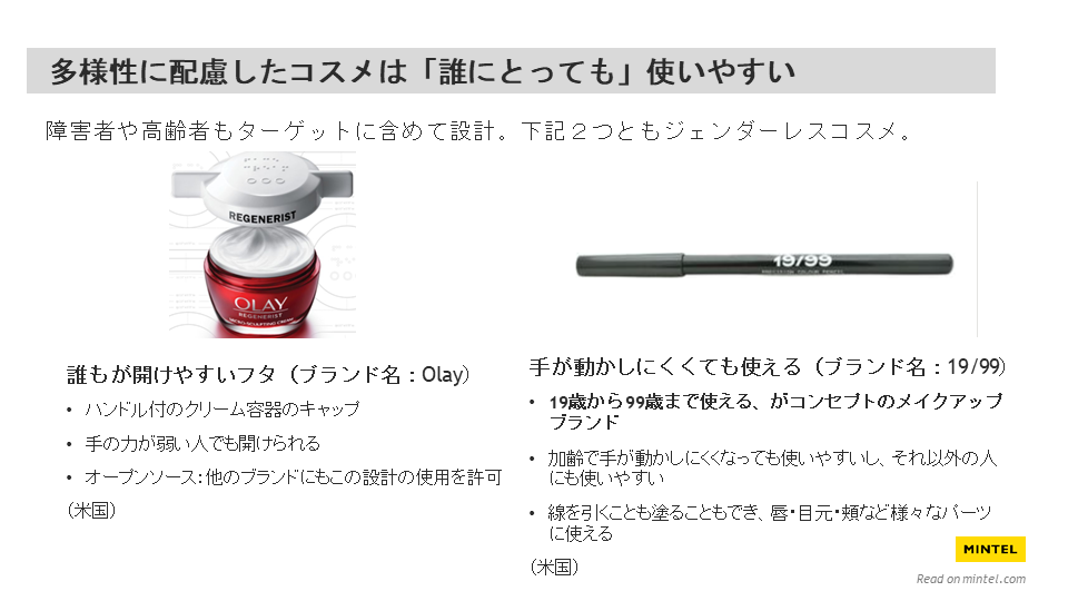 また、多様性に配慮する海外のジェンダーレスコスメには、「誰にとっても使いやすい」というコンセプトがあるとし、製品例として、「19歳から99歳まで使える」がコンセプトの米国のメイクアップブランド「19/99」のマルチユースペンシルなどを紹介しました。