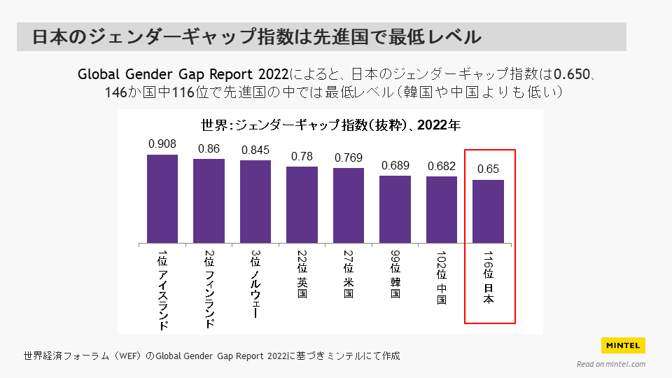 「日本のジェンダーギャップ指数は0.650、146ヵ国中116位。韓国や中国よりも低い数値。世界経済フォーラム(WEF)Gender Gap Report 2022に基づき、ミンテルにて作成した図」