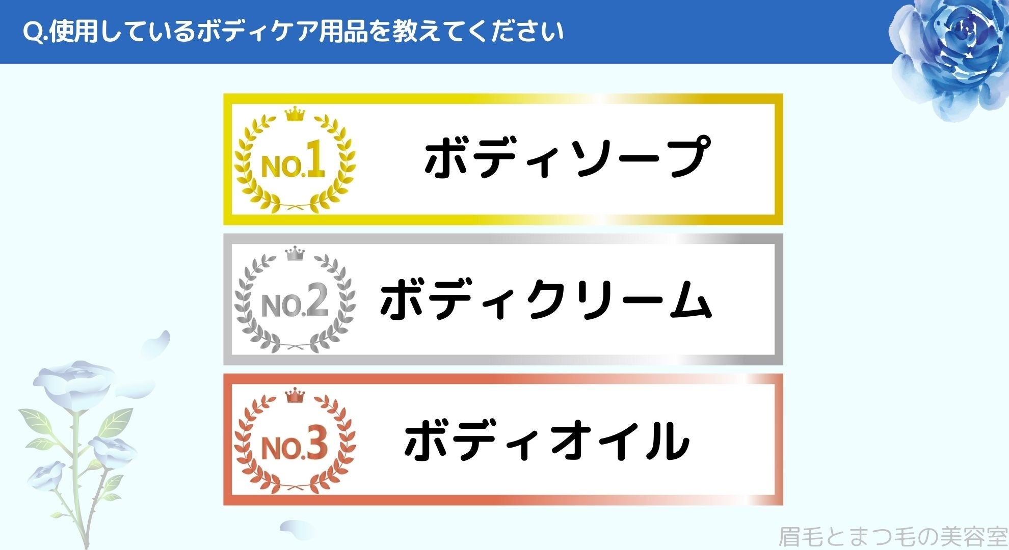 使用しているボディケア用品をお聞きしたところ「1位>ボディソープ」、「2位>ボディクリーム」、「3位>ボディオイル」という結果になりました。