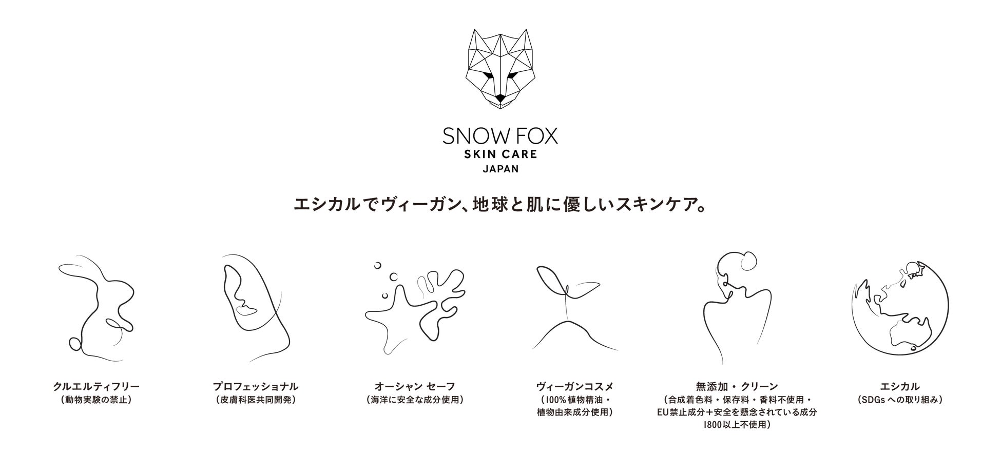 SNOW FOX SKINCAREは敏感肌向けに皮膚科医と共同開発し、無添加にこだわり開発された、植物学と皮膚科学を融合したハイブリッド型スキンケアです。地球第一主義を理念に、ヴィーガン・エシカル・クルエルティフリー・クリーン・プロフェッショナル・オーシャンセーフの6つの哲学を商品開発理念に掲げています。