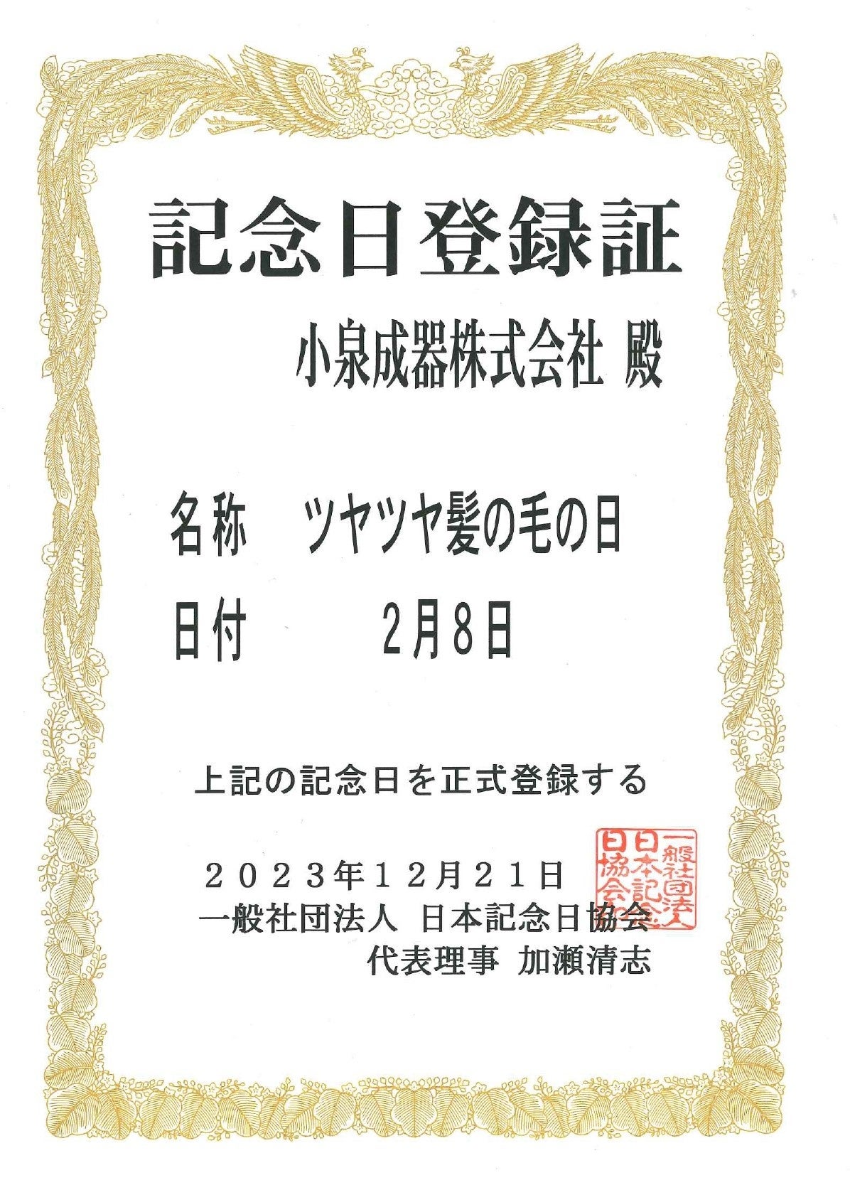 理美容器具などの自社商品の企画・開発と、国内外のメーカーブランド商品を取扱い、販売する代理店業を展開する小泉成器株式会社(本社:大阪市中央区備後町、代表取締役社長:橋本直志)は、2月8日を“「ツヤツヤ髪の毛」の日”として、一般社団法人日本記念日協会より、記念日登録の認定をうけましたのでお知らせいたします。