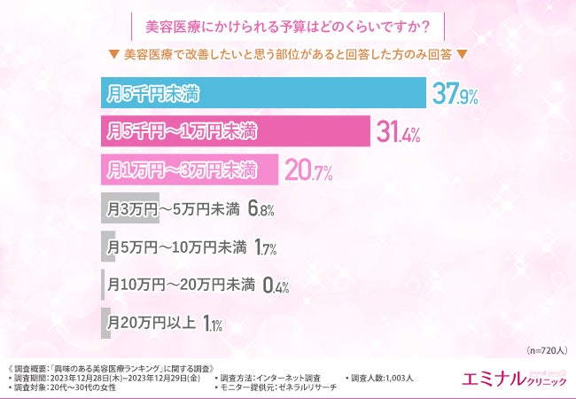 「美容医療にかけられる予算はどのくらいですか?」と質問したところ、『月5千円未満(37.9%)』と回答した方が最も多く、次いで『月5千円~1万円未満(31.4%)』『月1万円~3万円未満(20.7%)』と続きました。