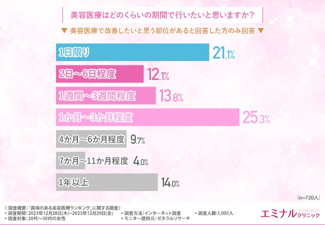 「美容医療はどのくらいの期間で行いたいと思いますか?」と質問したところ、『1日限り(21.1%)』と回答した方が最も多く、次いで『2日~6日程度(12.1%)』『1週間~3週間程度(13.8%)』『1か月~3か月程度(25.3%)』と続きました。
