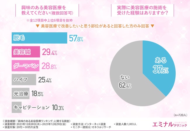 そこで今回、ダーマペン施術を手掛けるエミナルクリニック(https://eminal-clinic.jp/dermapen/?refmedia=70039)は、20代〜30代の女性を対象に「興味のある美容医療ランキング」に関する調査を実施しました。