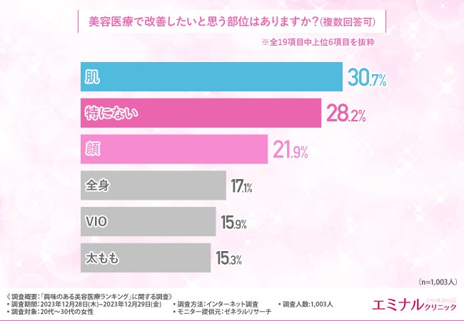 はじめに「美容医療で改善したいと思う部位はありますか?(複数回答可)」と質問したところ、『肌(30.7%)』と回答した方が最も多く、次いで『特にない(28.2%)』『顔 (21.9%)』と続きました。