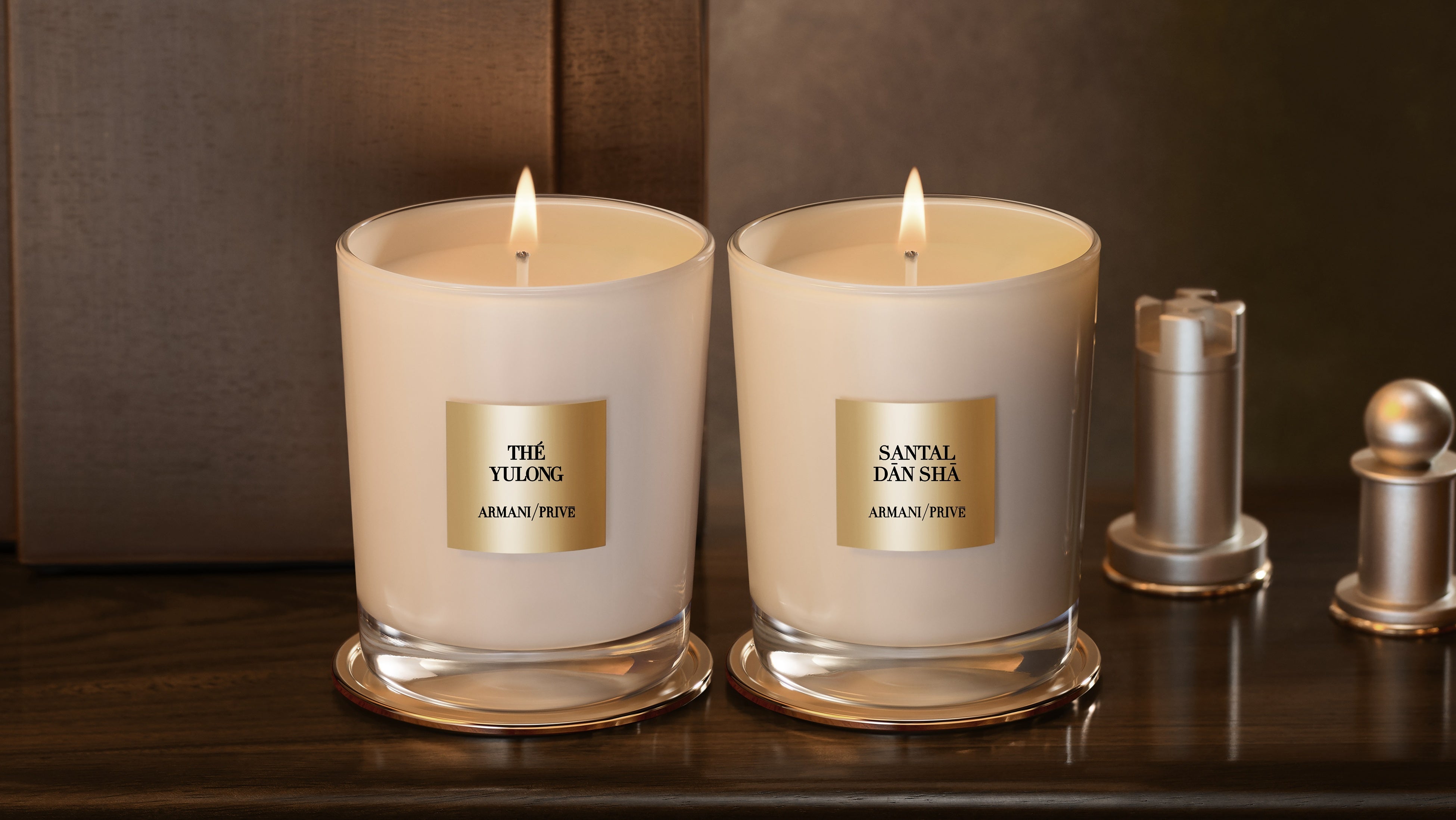 <アルマーニ プリヴェ センテッド キャンドル>は、アールデコにインスパイアされた曲線と調和の取れた形状を基調としたエレガントなデザインが特徴で、インテリアに合わせやすいアイボリー色にラッカーコーティングを施したガラスに、アイコニックなアルマーニ プリヴェのゴールド ロゴがあしらわれています。ゴールドのカバーは受け皿として、ロウを保護し、香りを保ち、キャンドルを消した後の煙の広がりを抑えるカバーとしても使用可能です。