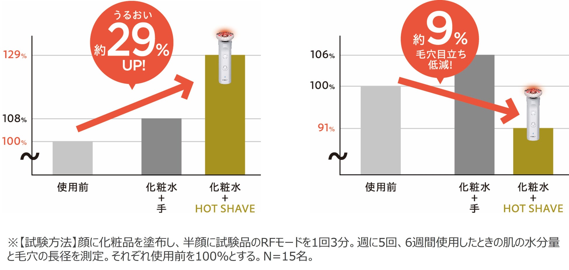 *8 【試験方法】顔に化粧品を塗布し、半顔に試験品のRFモードを1回3分。週に5回、6週間使用したときの肌の水分量と毛穴の長径を測定。