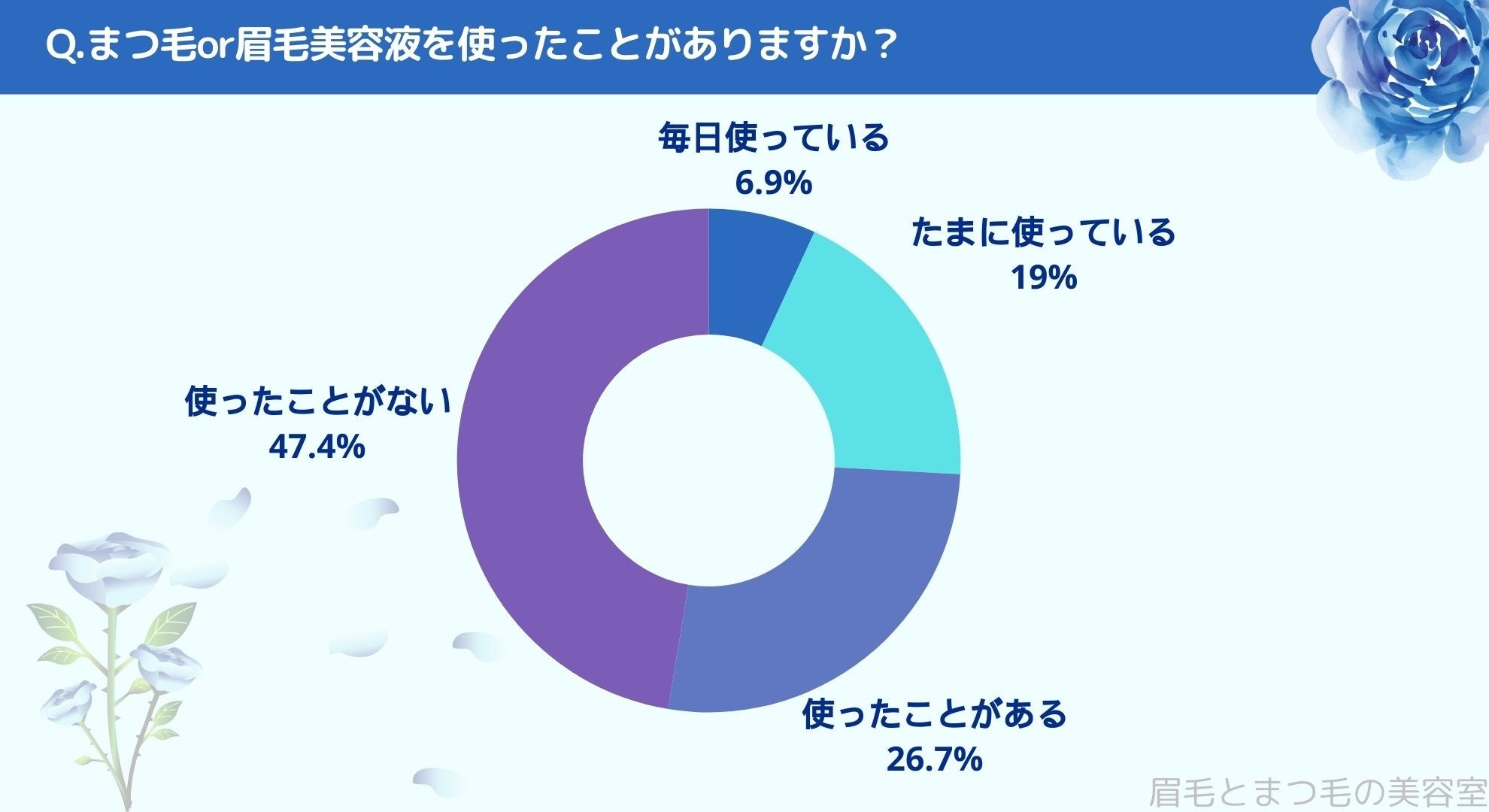 まつ毛or眉毛美容液を使ったことがあるかお聞きしたところ「毎日使っている(6.9%)」、「たまに使っている(19%)」、「使ったことがある(26.7%)」、「使ったことがない(47.4%)」という結果になりました。