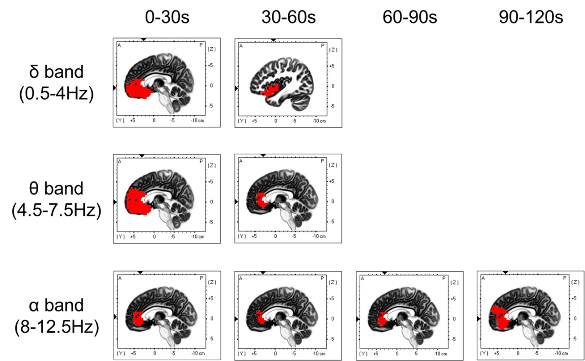 ワーキングメモリーには多くの脳領域が関与していることが知られていますが、前頭葉や海馬傍回におけるデルタ帯域、シータ帯域の脳活動が増加することが報告されています。