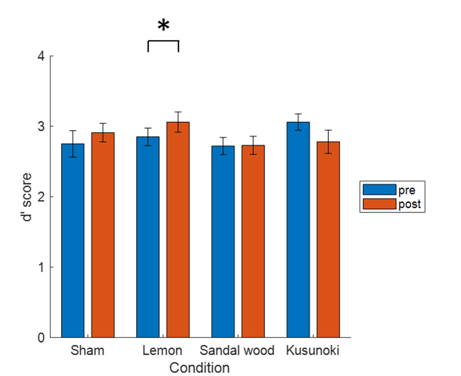 その結果、レモンの香り吸引後に、記憶課題の成績が有意に向上すること、サンダルウッド(白檀)の香りは、吸引時に記憶保持に関連する脳処理に寄与する可能性があることがわかりました。
