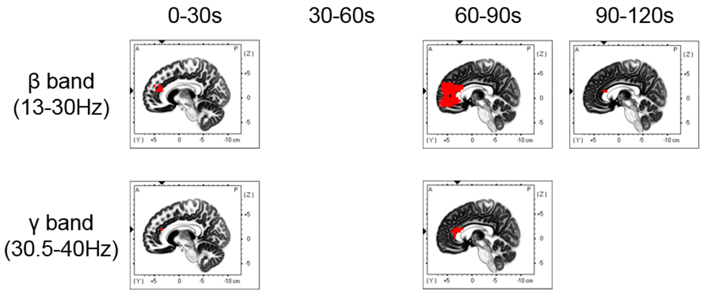 ◆サンダルウッド精油の吸入直後、帯状回を含む前頭前部領域の活性化は、ベータ帯域、ガンマ帯域において観察され、それぞれ120秒後、90秒後まで持続しました(図3)。