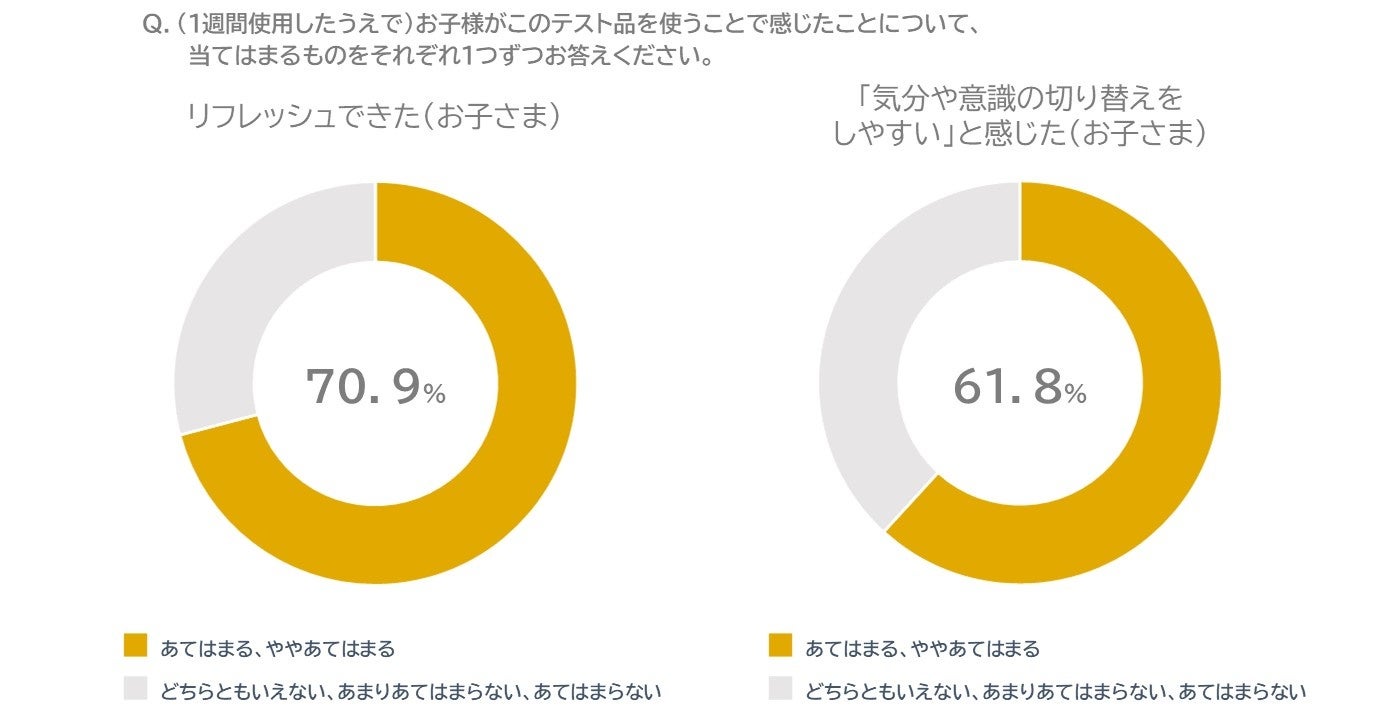 子どもの70.9%が「リフレッシュできた」、61.8%が「『気分や意識の切り替えをし易い』と感じた」と回答しており、集中力ややる気といった学習への直接的な貢献だけでなく、学習に向かうために気持ちの切り替えを促す可能性がうかがえます。