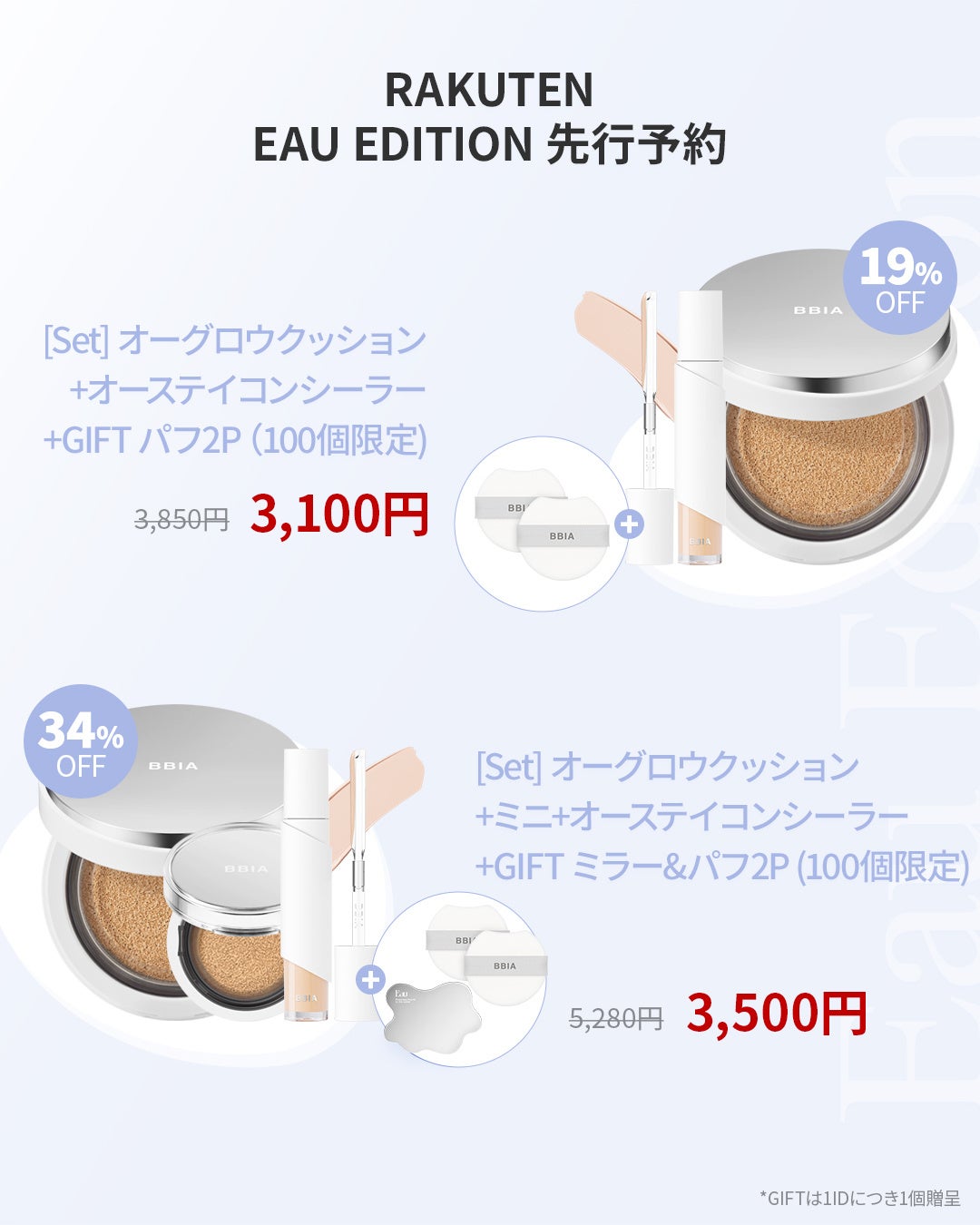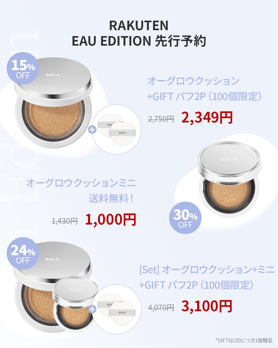 EAU EDITION(オーエディション)の発売を記念して、BBIA公式「楽天市場」で2月1日(木)0時より先行予約販売イベントを開催します。新商品オーグロウクッション、オーステイコンシーラーはもちろん、セット商品や数量限定プレゼントまで、最大34%の割引価格でお求めいただけます。