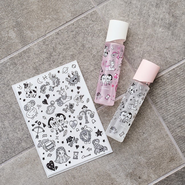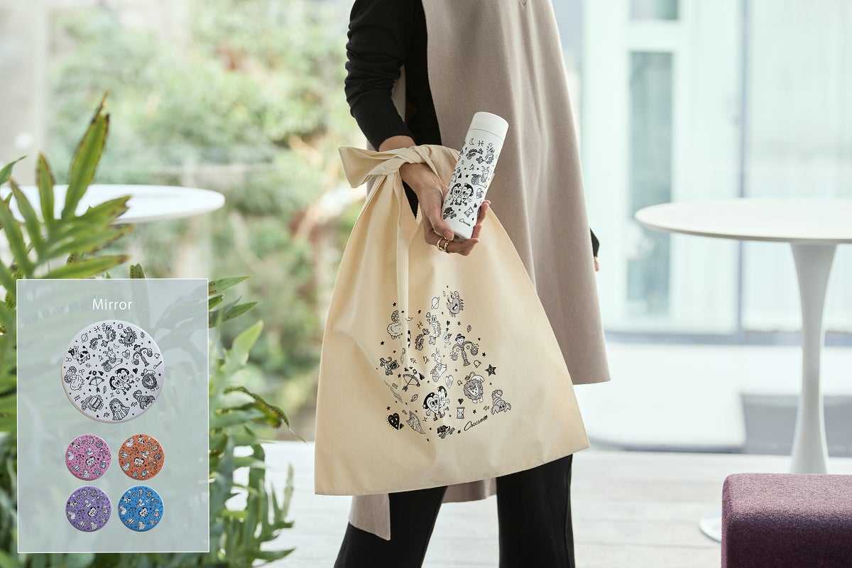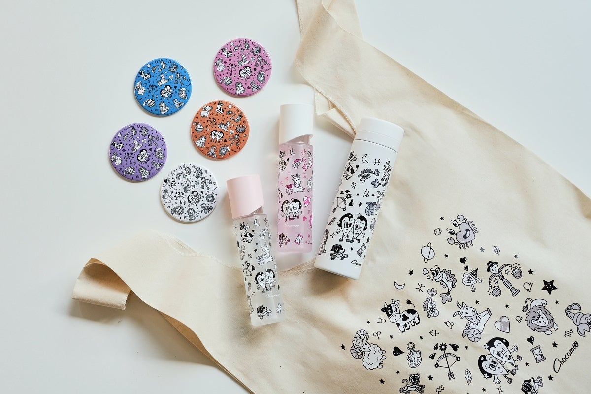 Chocomoo氏のPOPで可愛らしいデザインをプリントした、コラボレーション限定アイテムも販売します。12 星座を一つの世界観に閉じ込めたオリジナルステンレスサーモボトル、トートバッグ、缶ミラー(5色展開)が『SKINCARE LOUNGE BY ORBIS』限定で購入いただけます。