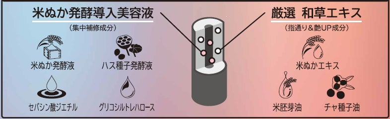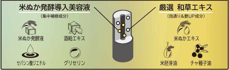 集中補修成分「米ぬか発酵導入美容液」として、「米ぬか発酵液」、「酒粕エキス」、