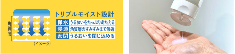 水分・油分・美容成分をバランスよくお肌に補給する、トリプルモイスト設計で、角質層のすみずみまでうるおいをあたえて閉じ込めます。