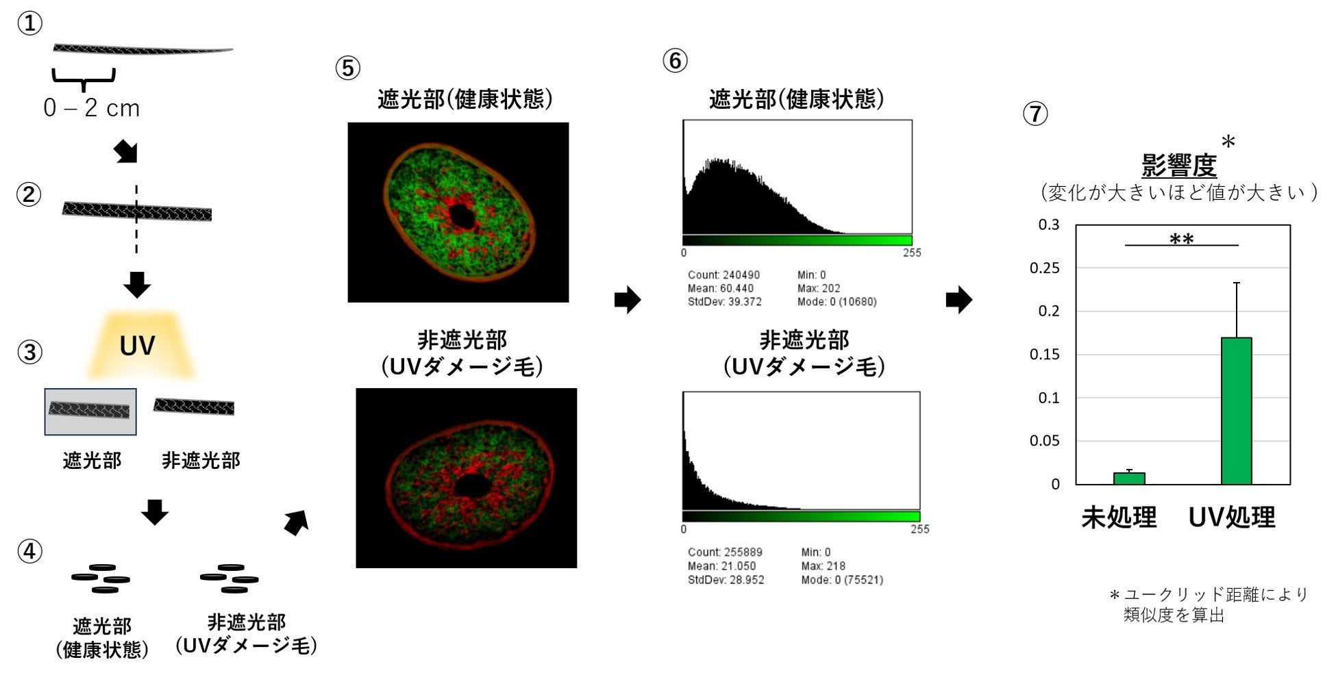 毛髪を根元から採取し(①)、根元2cmを半分に分け(②)、片側だけを遮光し、それぞれにUV処理を行います(③)。次に、これらのサンプルを切片化し(④)、FS-SR染色を行います(⑤)。この染色結果より緑の輝度ヒストグラムを作成し(⑥)、それらを比較することで影響度を算出します(⑦)。⑦はUV処理の有無での影響度を比較しています。