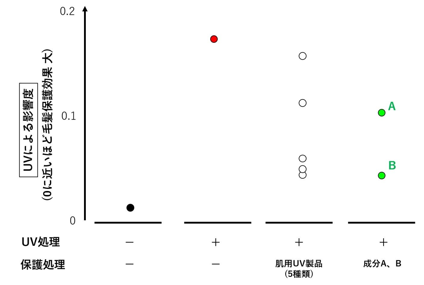 実際に、この手法を用いて毛髪におけるUV保護効果を示す成分のスクリーニングを行ったところ、一般的なUV吸収剤やUV散乱剤とは異なる成分において、市販の肌用UVケア製品(SPF50+、PA++++)と同等のUV保護効果を示す効果が認められました(図2)。