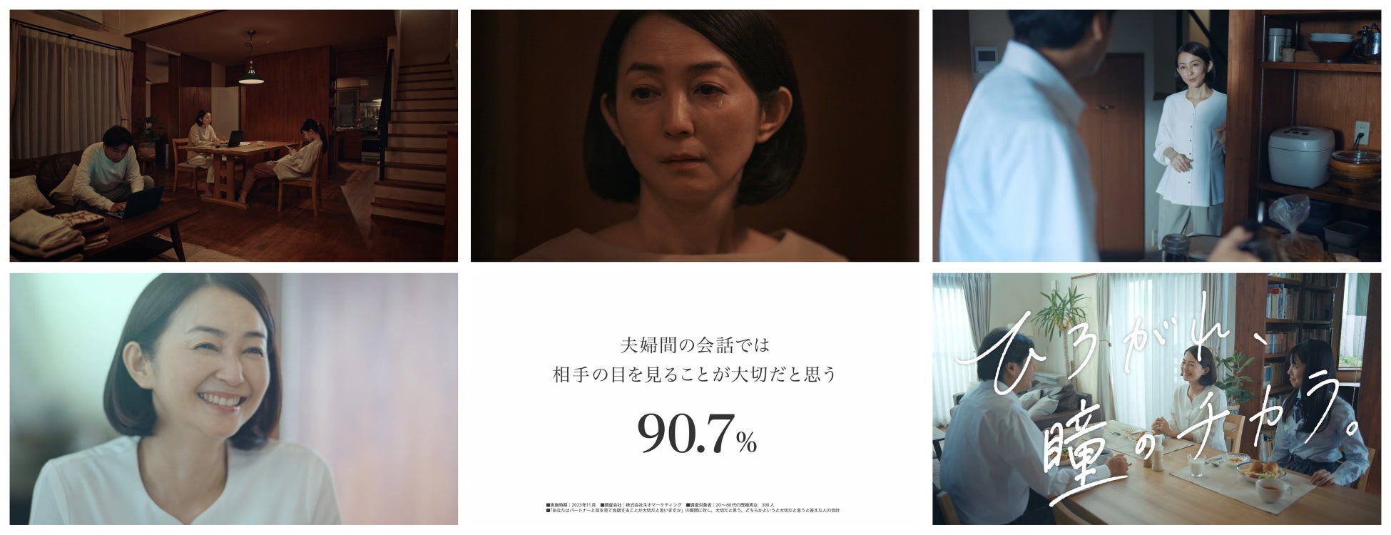 「夫婦間の会話では相手の目を見ることが大切だと思う 90.7%」という調査結果とともに、夫婦間の「目」を介したコミュニケーションの大切さを伝えています。