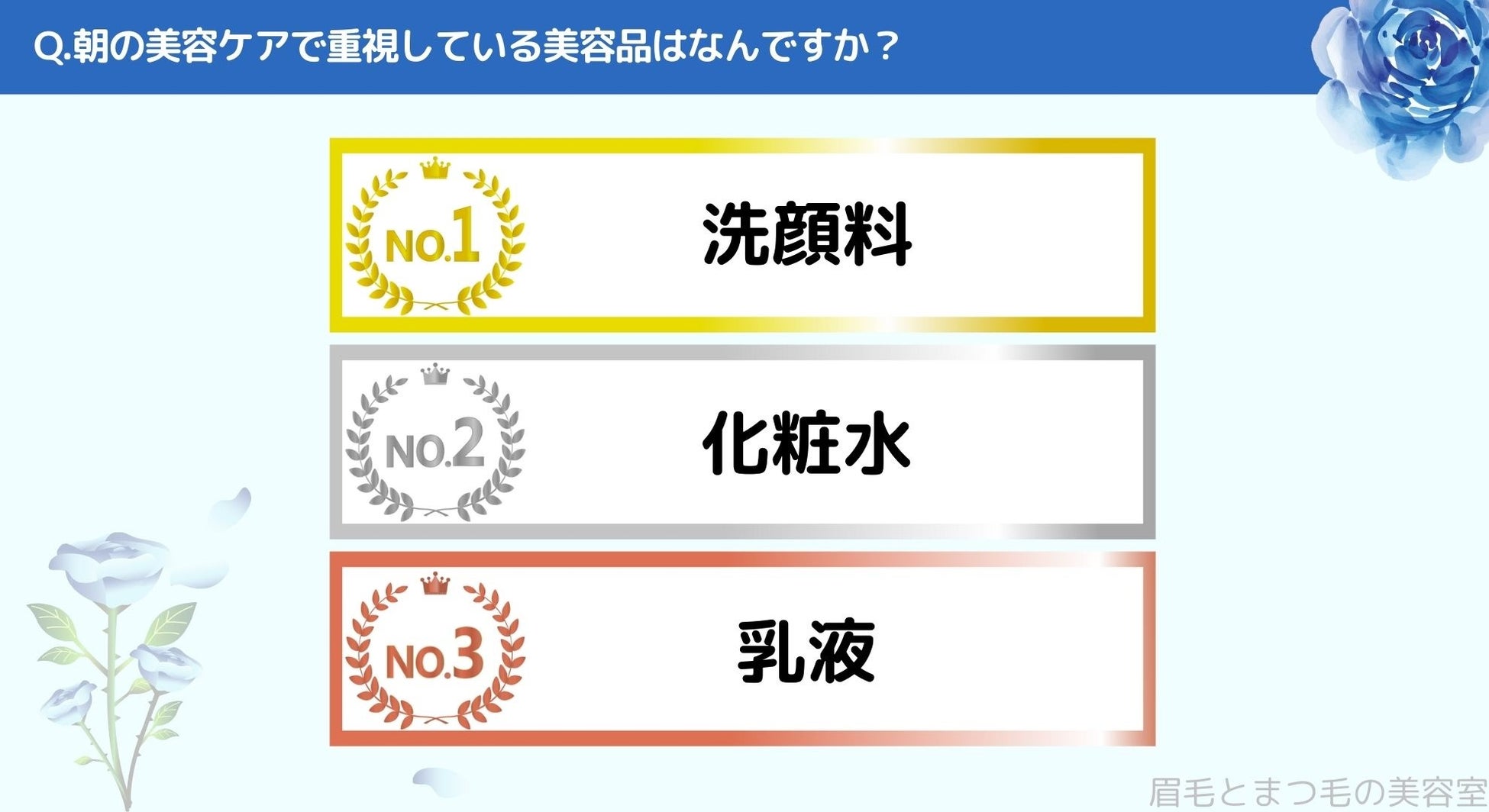 朝の美容ケアで重視している美容品をお聞きしたところ「1位>洗顔料」、「2位>化粧水」、「3位>乳液」という結果になりました。