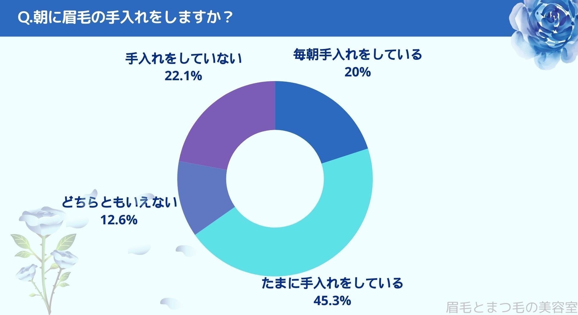 朝に眉毛の手入れをしているかお聞きしたところ「毎朝手入れをしている(20%)」、「たまに手入れをしている(45.3%)」、「どちらともいえない(12.6%)」、「手入れをしていない(22.1%)」という結果になりました。