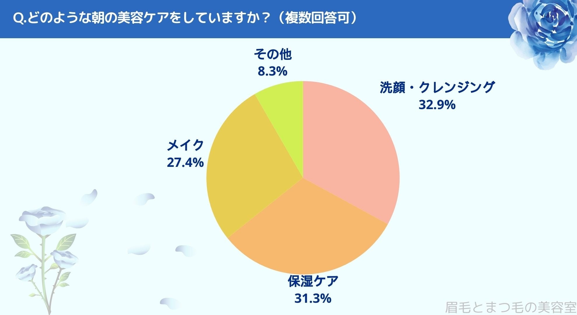どのように朝の美容ケアをしているかお聞きしたところ「洗顔・クレンジング(32.9%)」、「保湿ケア(31.3%)」、「メイク(27.4%)」、「その他(8.3%)」という結果になりました。