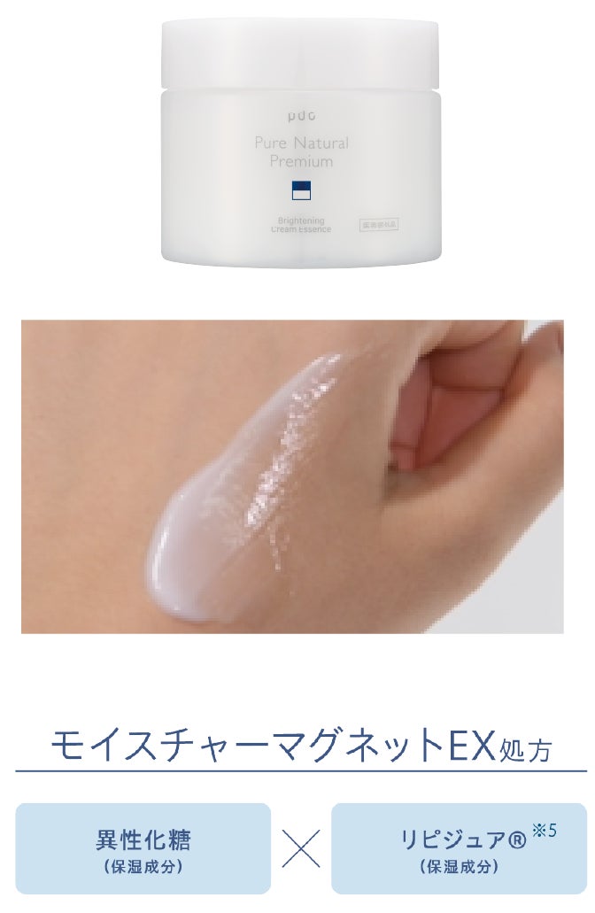 クリームエッセンスにのみ、保湿力の高い異性化糖とリピジュア※5を配合したモイスチャーマグネット処方を採用。肌にうるおいヴェールをつくり、たっぷりのうるおいを閉じ込めてもっちり肌へ導きます
