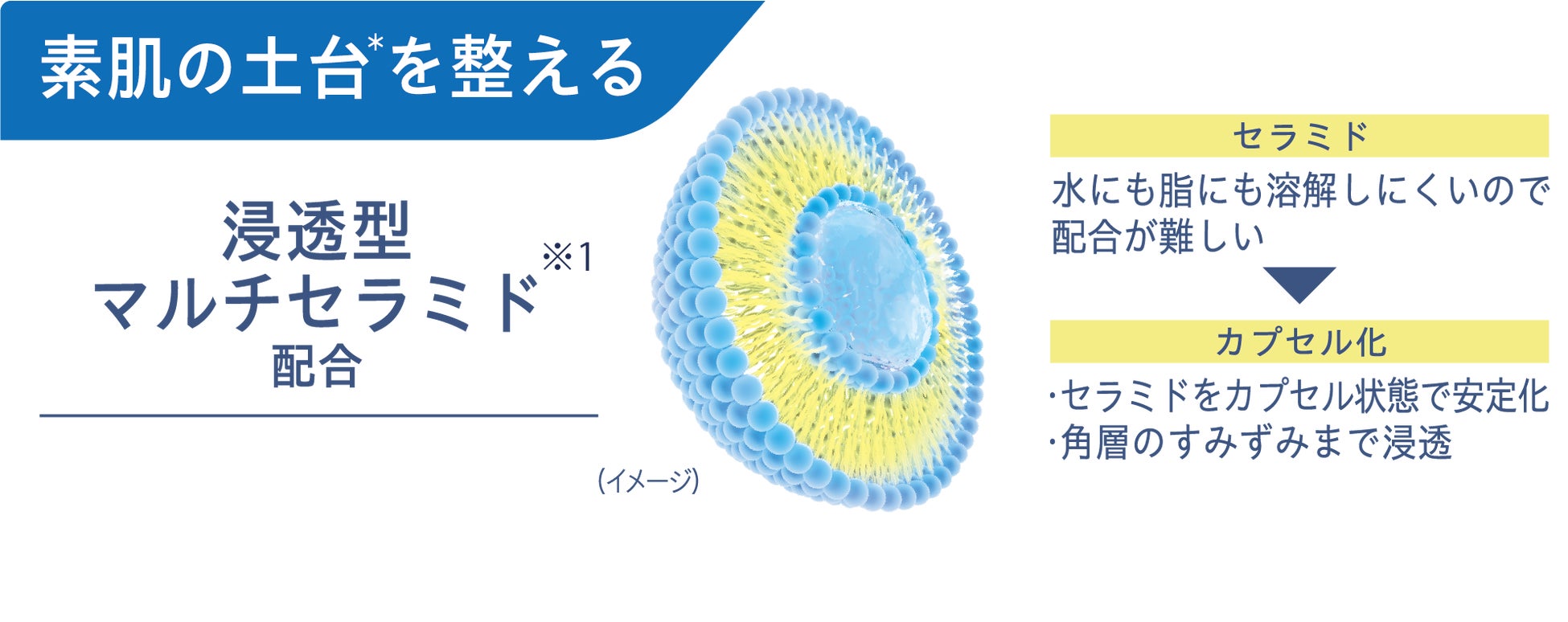 乾燥によって荒れやすい肌をケア。ヒト型セラミド4種をバランスよくカプセル化。カプセル化することで、お肌の隅々まで浸透※2させ、乾燥からまもり素肌の土台を整えます。