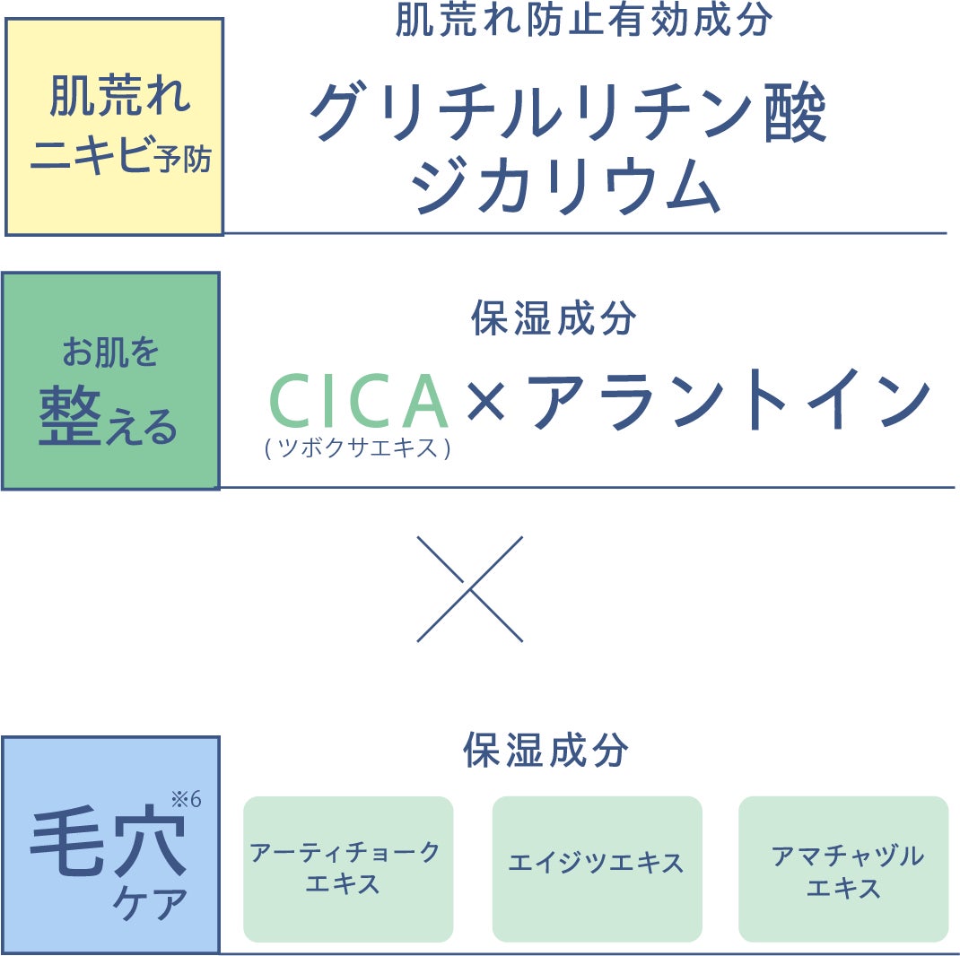 肌荒れをケアしながら整える有効成分 グリチルリチン酸ジカリウムに加えて、うるおいを与えてお肌を整える保湿成分のCICA※7・アラントインを配合。肌トラブルを防いで 角層深くまでうるおいで満たします!