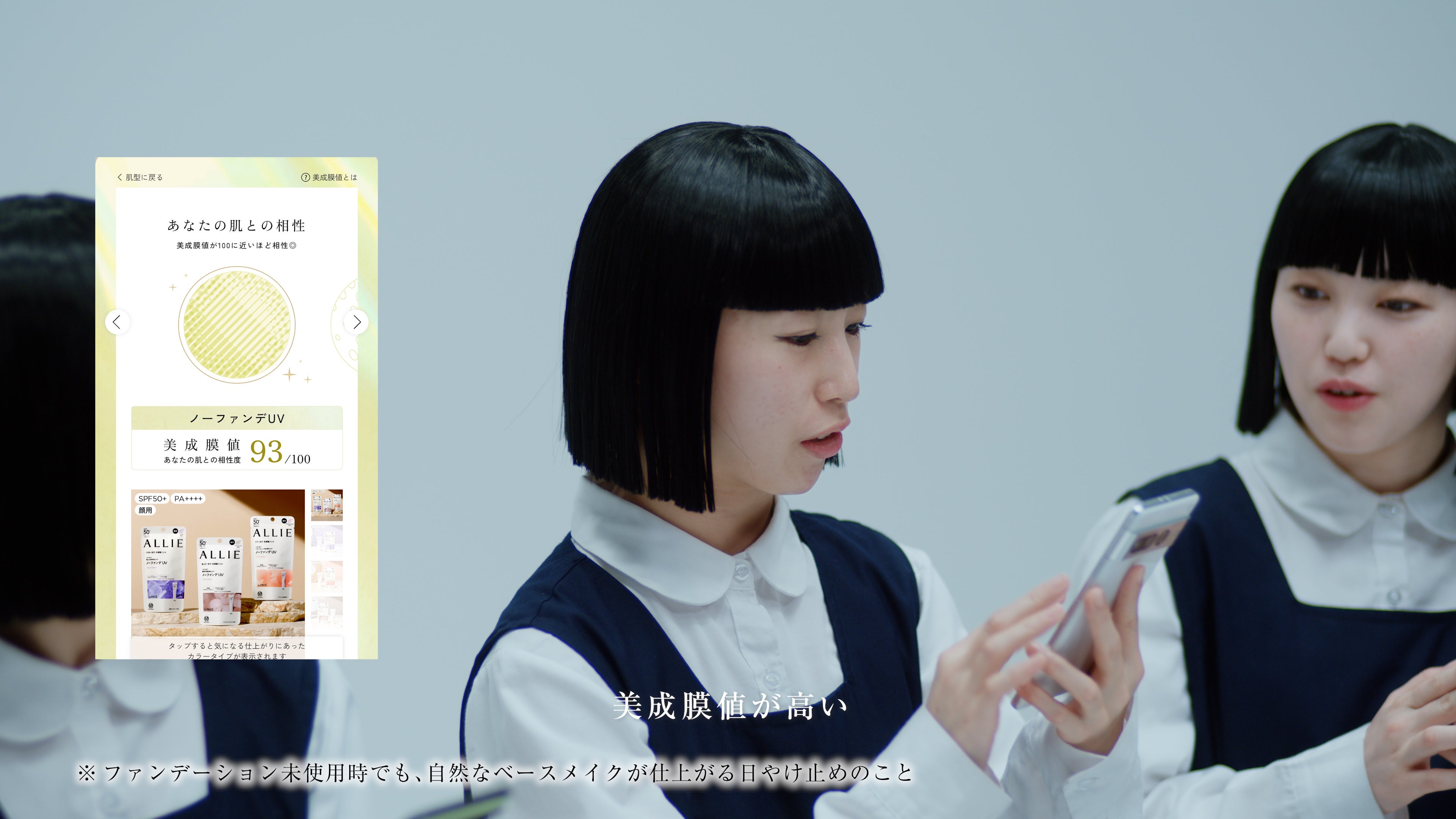 AIによって科学的な日やけ止め選びをサポート。肌との相性の良さを「美成膜値」としてスコア化し、ALLIE商品の中からあなたの肌に相性の良い商品を提案します。