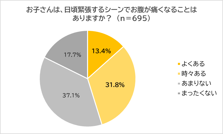 受験生のお子さんがいる母親に「お子さんは、日頃緊張するシーンでお腹が痛くなることはあるか?」尋ねました。「あまりない」(37.1%)が最も多く、「時々ある」(31.8%)、「まったくない」(17.7%)、「よくある」(13.4%)となり、45.2%のお子さんが緊張時の腹痛に悩んでいることがわかりました。