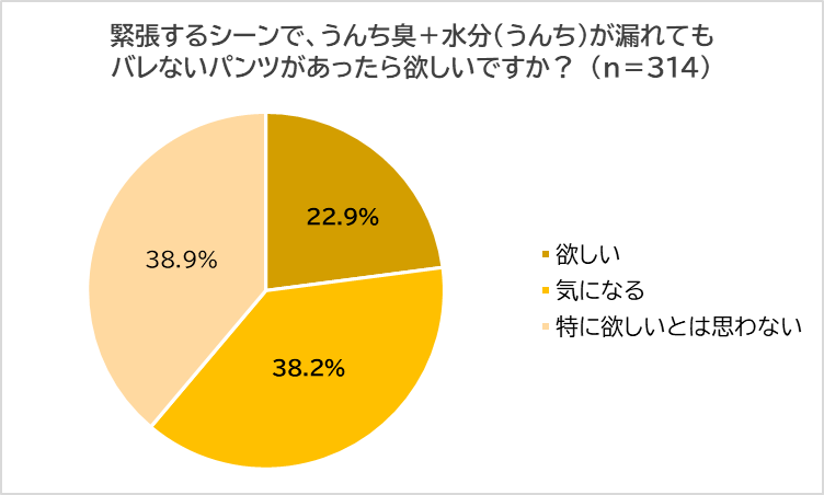 最後に、「緊張するシーンで、うんち臭+水分(うんち)が漏れてもバレないパンツがあったら欲しいか?」尋ねたところ、「欲しい」は22.9%だったものの、「気になる」(38.2%)も多くいる結果となりました。