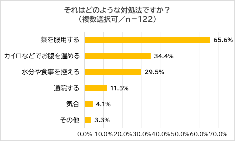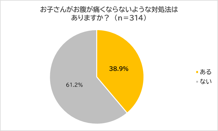 お子さんは緊張すると腹痛になることが「よくある」「時々ある」と回答した314人に「腹痛にならないような対処法はあるか?」尋ね、「ある」(38.9%)と回答した122人に「どのような対処法か?」尋ねました。最多は「薬を服用する」(65.6%)で、以下「カイロなどでお腹を温める」(34.4%)、「水分や食事を控える」(29.5%)、「通院する」(11.5%)となり、「気合」(4.1%)も僅かにいました。