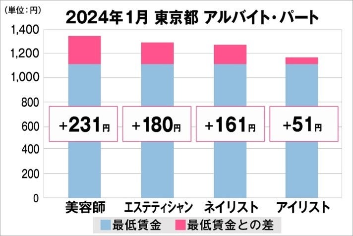2024年1月時点で『美プロ』に掲載されている「東京都」の「美容師・エステティシャン・ネイリスト・アイリスト」求人における「正社員」「アルバイト・パート」の給料を抽出。