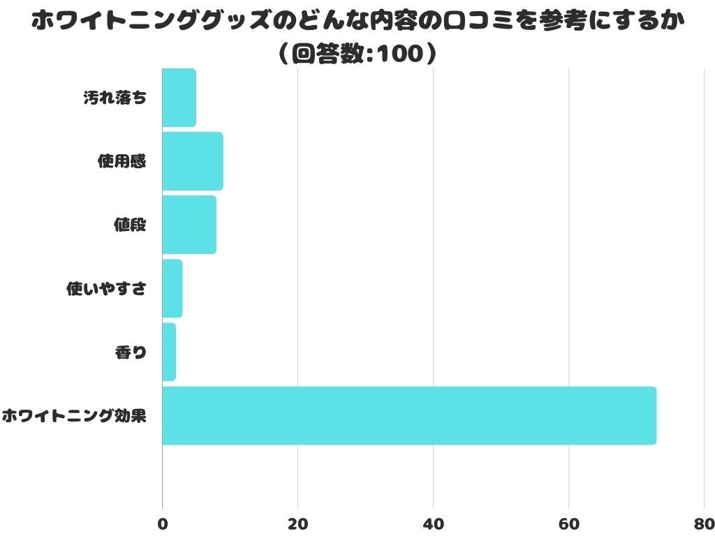 ホワイトニンググッズのどんな内容の口コミを参考にするかをアンケートにて調査したところ、1位は「ホワイトニング効果」でした。