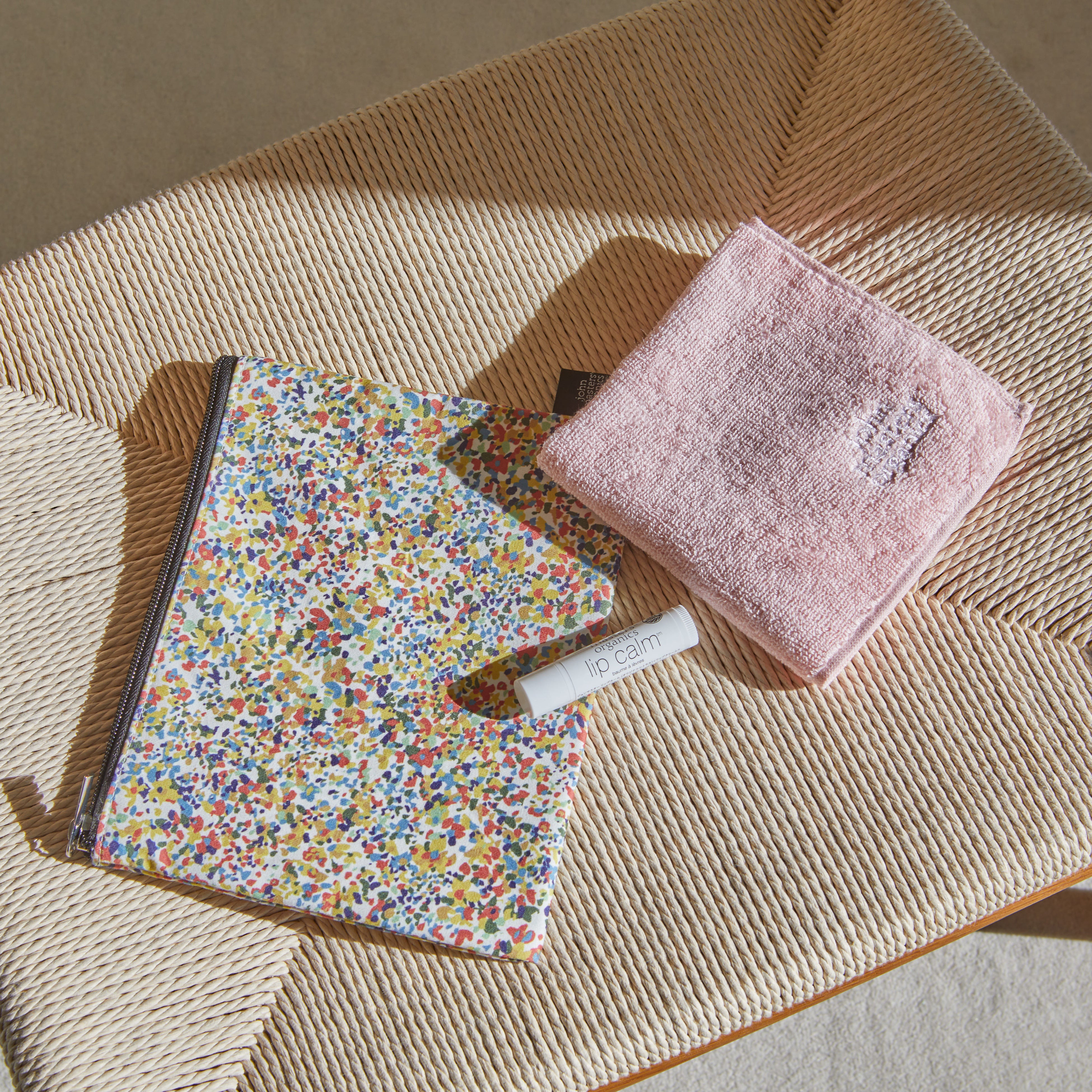 今回は、1978年に制作されたリバティのアーカイブ・プリントを再描画した「サン・スペックル」の生地を使用。鬱蒼とした森の木漏れ日を抽象的に落とし込んだデザインのオリジナルポーチと巾着、エコバックによるギフトセットを展開します。春の植物が織りなす、温かみのある色と幸福感溢れる陽の光、木々や花々の生命力をギフトと共に。