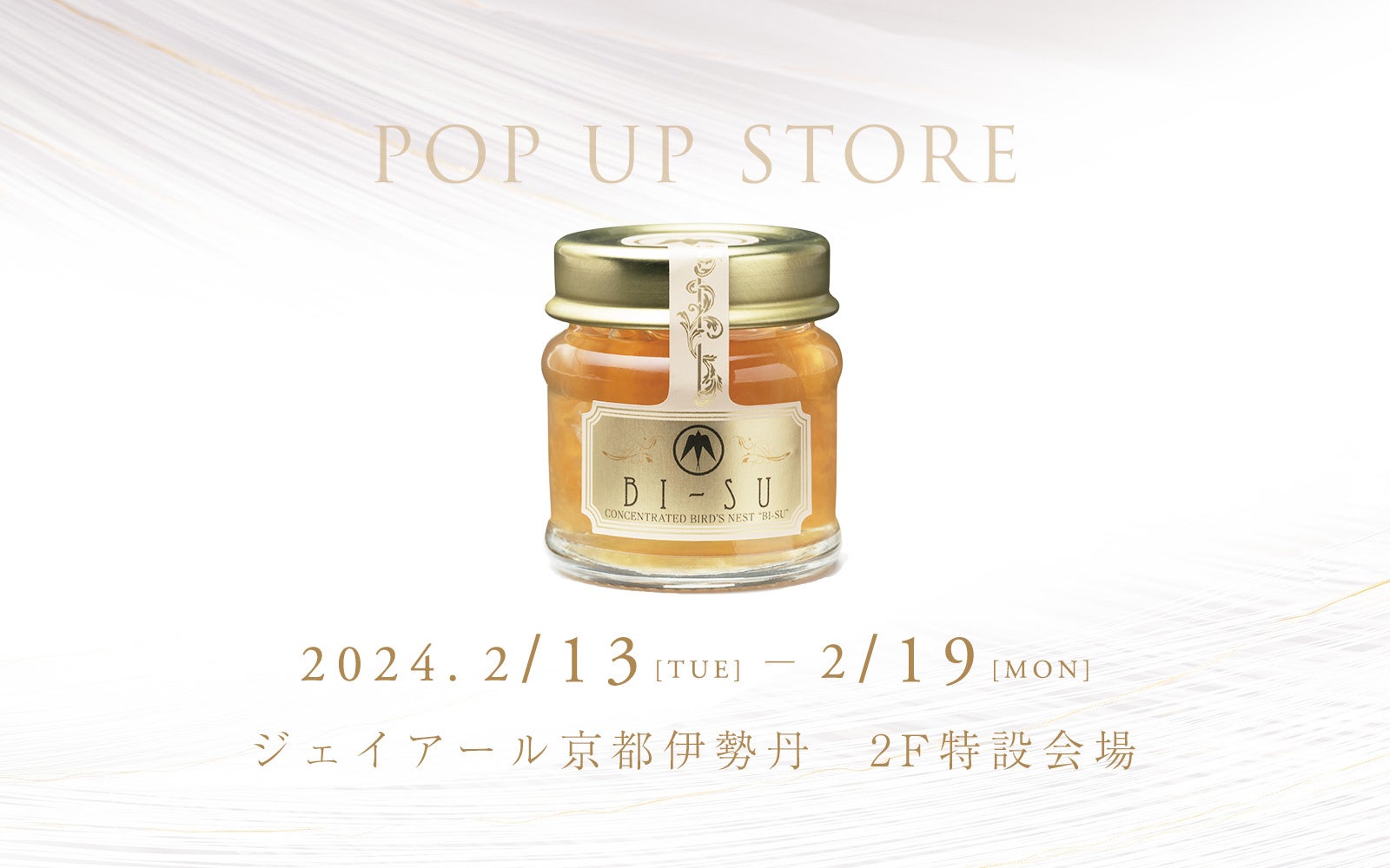 大人気のBI-SUエキスゼリースティックをはじめ、希少な天然アナツバメの巣をまるごと瓶詰めした「BI-SU16(食べるタイプ)」※も特別に数量限定にてご用意いたしました。他にもシャンプーなどヘアケア商品、ローションやセラムなどコスメ商品も多数ご用意し、天然アナツバメの巣の美容成分を贅沢に配合したラインナップとなっております。季節の変わり目のお肌のケアなどにも最適なラインナップを取り揃えております。ぜひこの機会にお立ち寄りくださいませ。