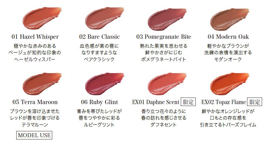 うるおいを秘めた湿度感のある自然なツヤと、鮮やかさの中にグレイッシュな要素をひそませたカラーが、色の個性を主張しながらも肌に溶け込むようになじむ設計。唇だけが浮くことなくシームレスな仕上がりに。