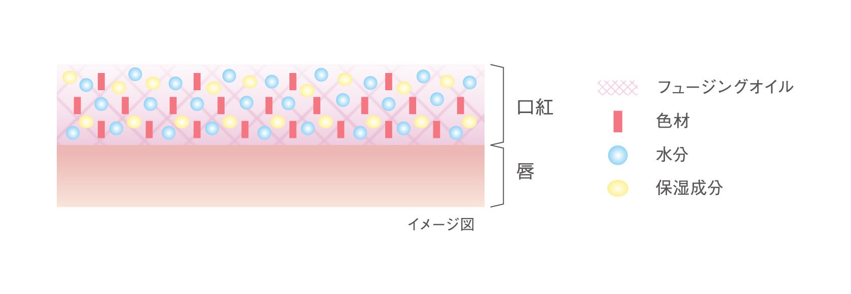 呼気や唇の水分に反応してフュージングオイルがゲル化し、口紅の色材と水分を抱えこみ密着するネット構造を形成。唇の動きにしなやかに追従するストレッチ性の高い塗膜が均一な一枚膜となり、美しい仕上がりが長時間持続。うるおい感のある唇をキープします。