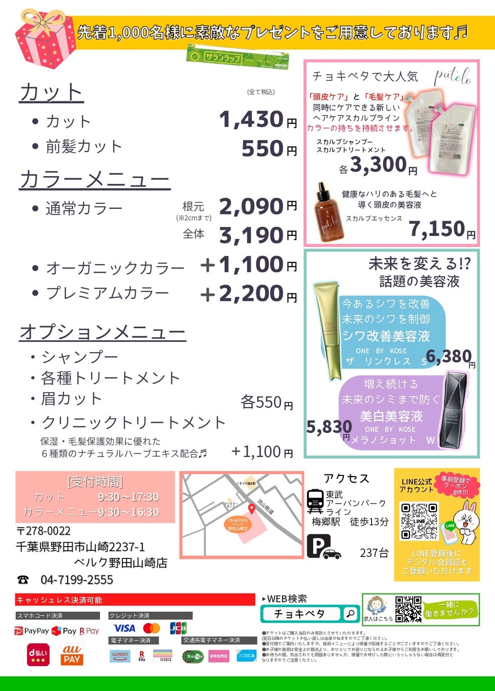 来店されたお客様に「チョキペタに来て良かった」、「また来たい」と思っていただける店舗にするべく、スタッフ一同頑張りたいと思います。